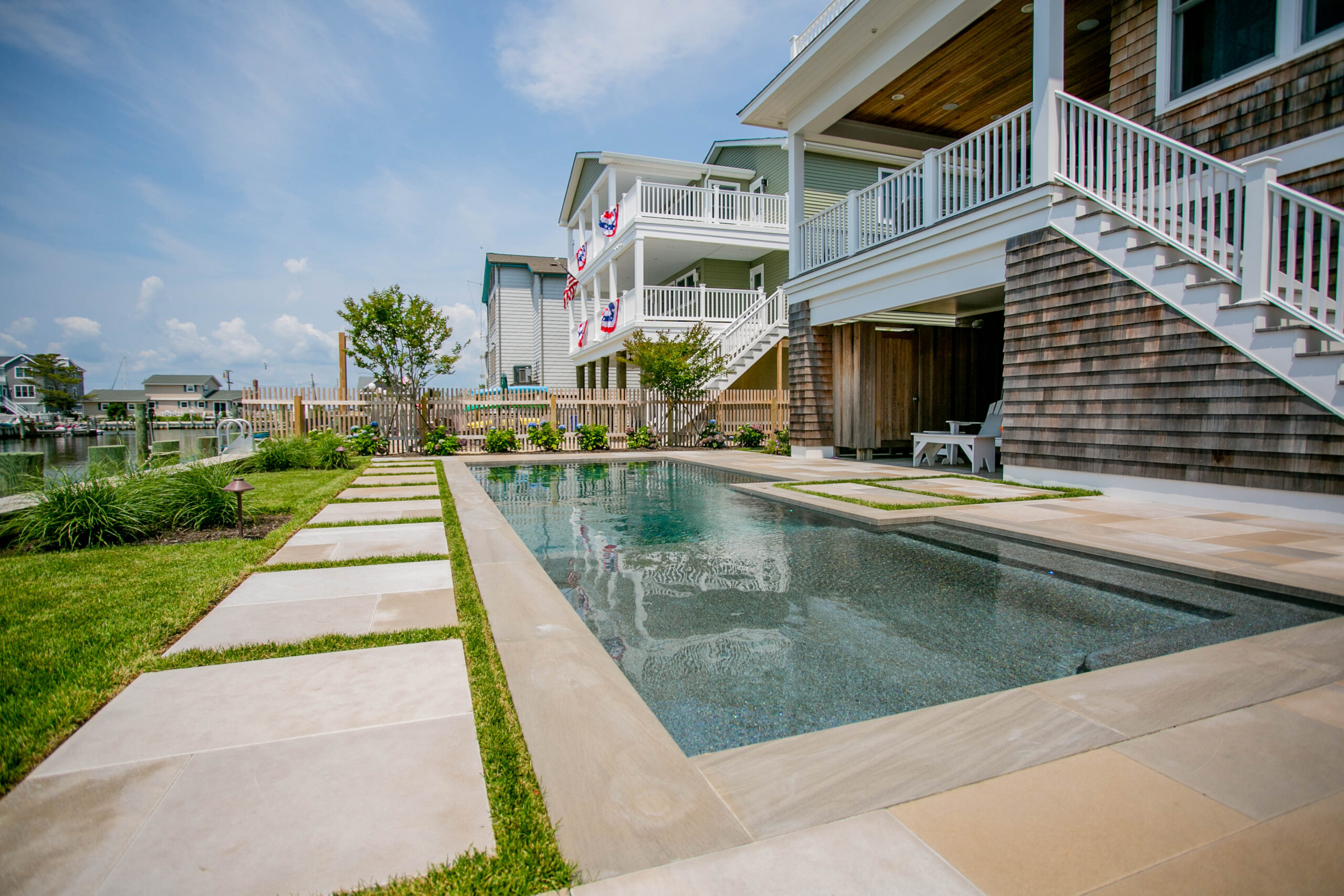Hardscape-integrated pool decks, coping, and surrounding terraces that blend safety and refined coastal style.