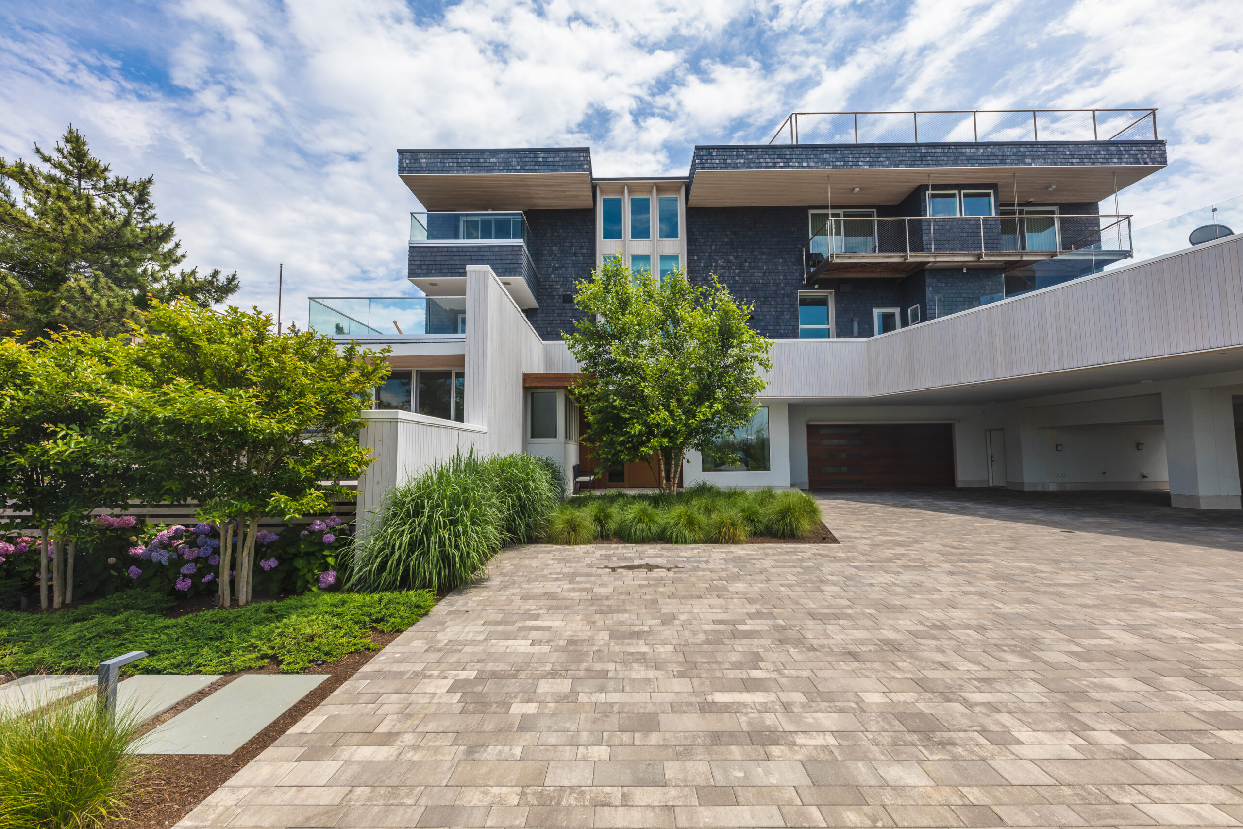Bluestone, limestone, fieldstone, and high-quality pavers all perform exceptionally well in coastal environments. These materials resist salt, sun, heat, and moisture better than many alternatives. During the design process, we help you choose the right material based on aesthetics, function, and long-term durability.